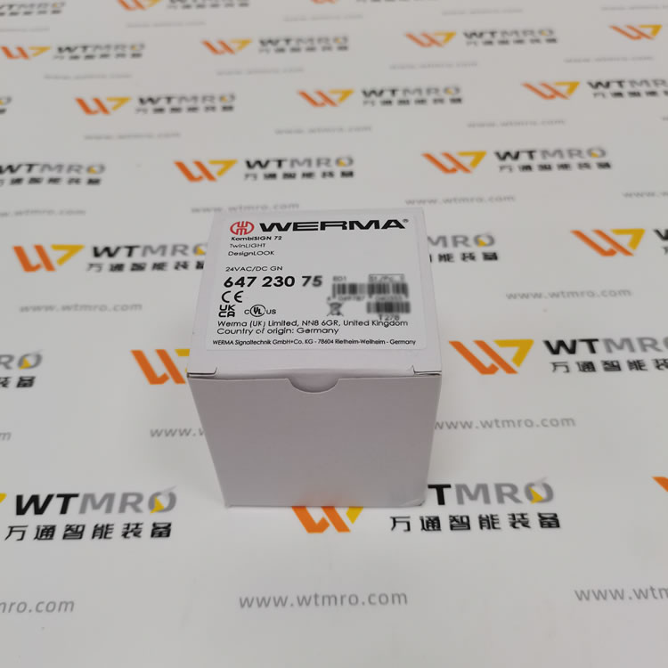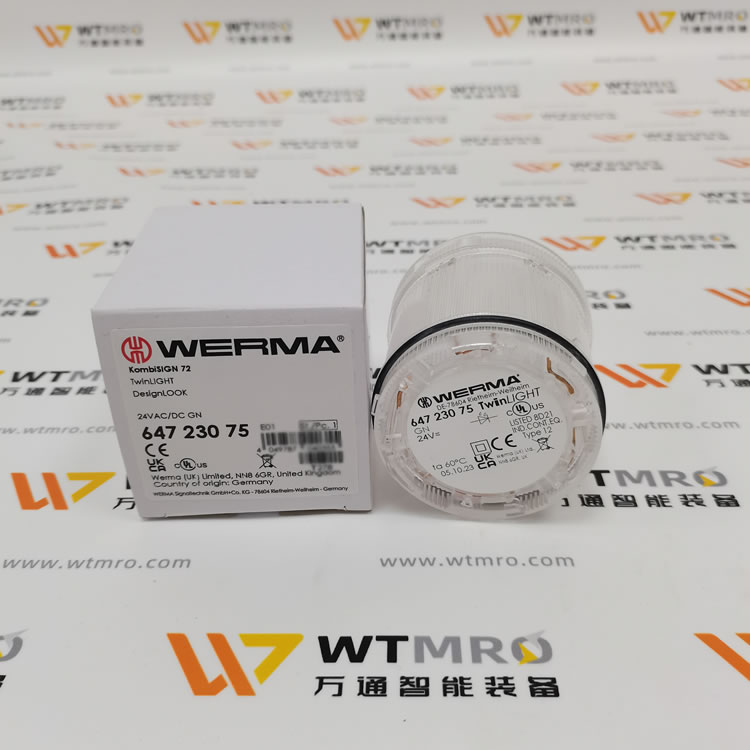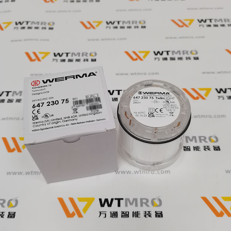 WERMA 647.230.75绿色指示灯信号灯,是工业环境中理想的信号传递助手。它采用高效LED光源,发出的绿光明亮且柔和,闪烁模式清晰易辨,能准确传达设备正常运行、系统就绪等积极信号。