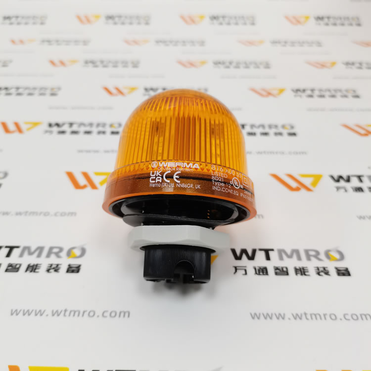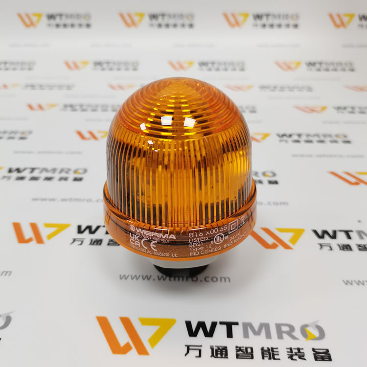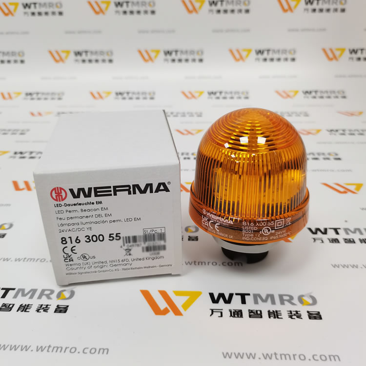 WERMA 816.300.55 816 系列黄色常亮 LED 连续信标灯塔。灯体采用 PC/ABS 高强度材质,圆顶为黄色透光结构,防护等级 IP65,适配工业复杂工况。